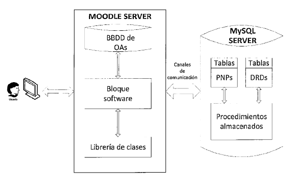 El servidor 1 gobierna la ejecución del procedimiento, soporta la lectura de las necesidades personales que introduce el alumno y la carga de los objetos de aprendizaje por parte del profesor, alberga la base de datos de objetos de aprendizaje y sus adaptaciones, establece los canales de comunicación necesarios para el intercambio de información entre los servidores y gestiona el refresco de la caché web en el ordenador del estudiante. El software instalado en el servidor 1 ha sido diseñado en su mayor parte de forma independiente a la tecnología Moodle, permitiendo así su reutilización y la escalabilidad del sistema. El servidor 2 soporta las bases de datos de necesidades personales de los estudiantes y recursos digitales haciéndolas portables a cualquier otro sistema, siendo esta la razón principal por la que se ha utilizado un servidor exclusivo para este fin.